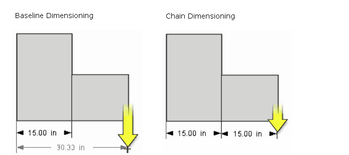 Baseline and chain dimensioning tools allow you to make multiple measurements. Baseline dimensions are a series of inclusive measurements made from one shared starting point. Chain dimensions are a series of individual measurements, one after another, in a row.